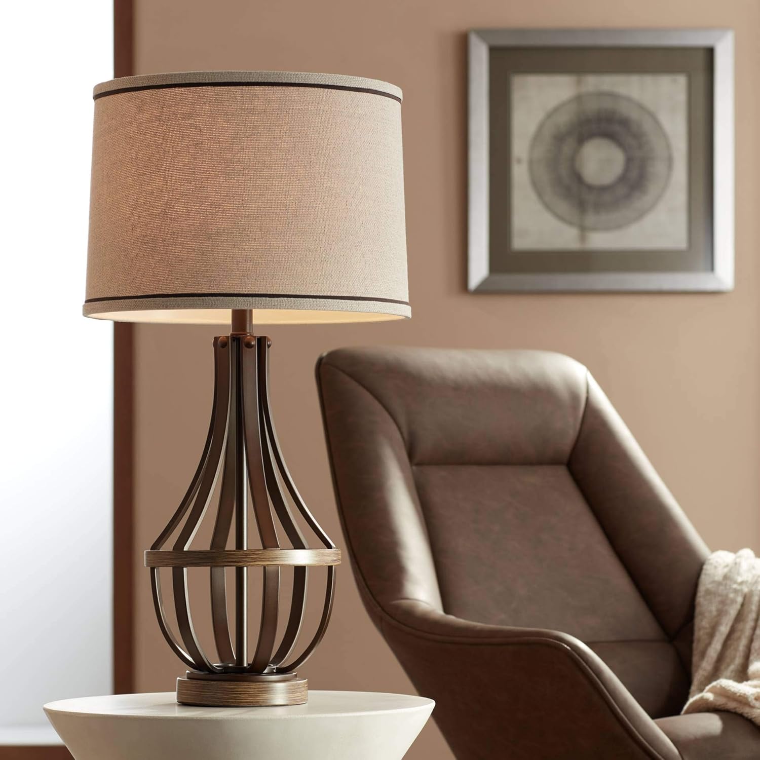 Louanne Industrial Farmhouse Table Lamp Oil Rubbed Bronze Light Wood Cage Burlap Linen Drum Shade For Living Room Bedroom Bedside Nightstand Office Family Franklin Iron Works Amazon Com Ikea Vimle Living Room