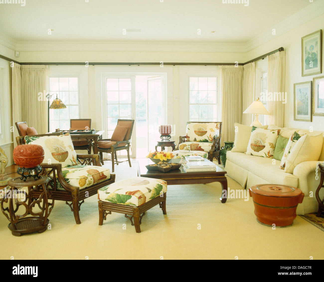 - Large Floral Print Cushions On Dark Wood Chair And Stool In Bermudan Living Room With Cream Carpet And Sofa Stock Photo Alamy