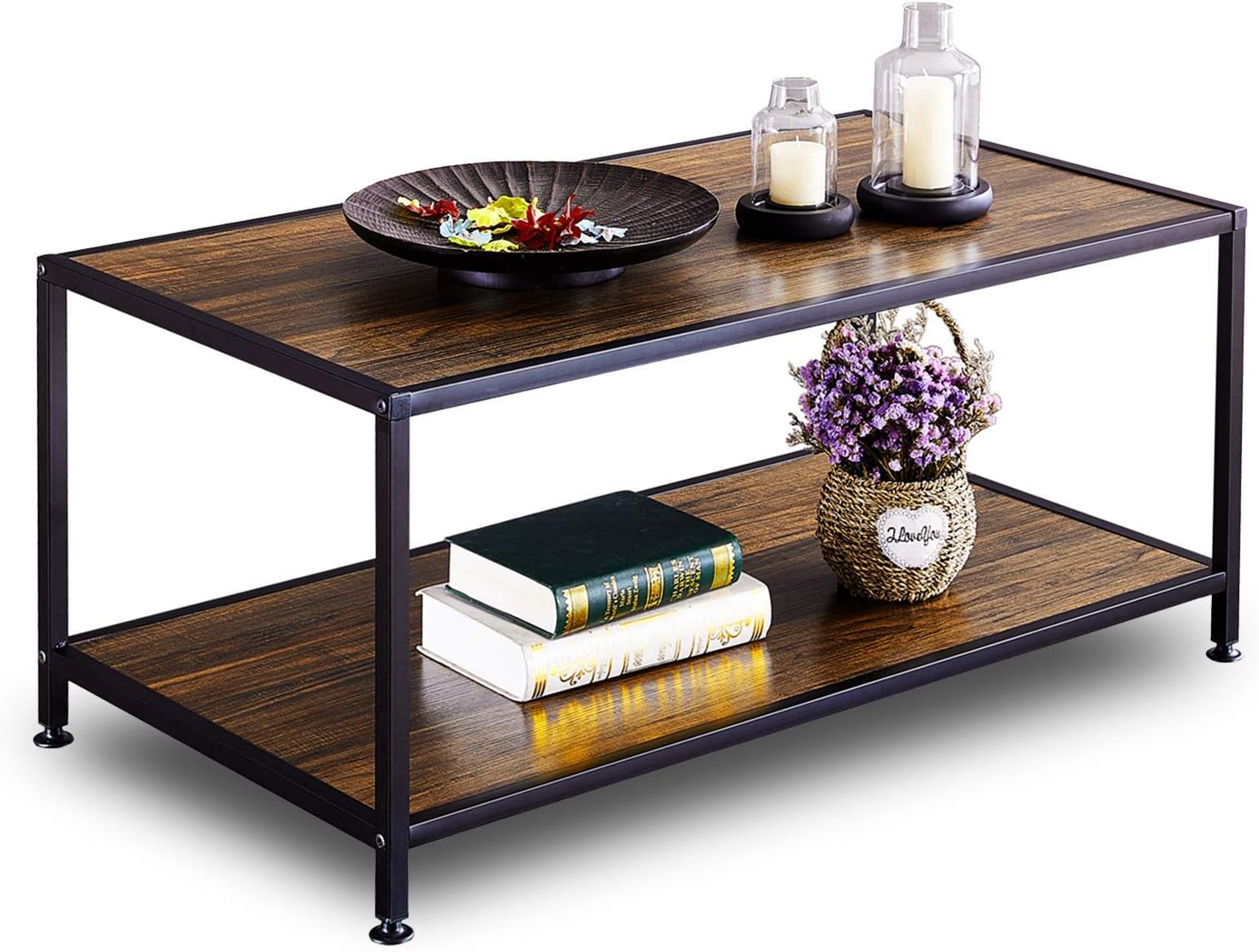 Amazon Com Greenforest Coffee Table Industrial For Living Room Metal Frame Open Shelf Storage Walnut Home Kitchen Living Room Ideas Leather And Fabric