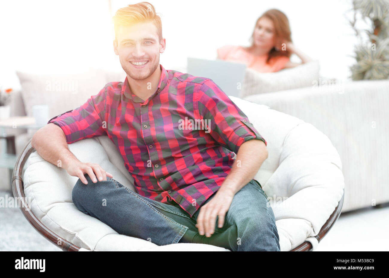 Modern Young Man Sitting In A Big Round Chair On Blurred Background Stock Photo Alamy Modern Living Room Design With Tv