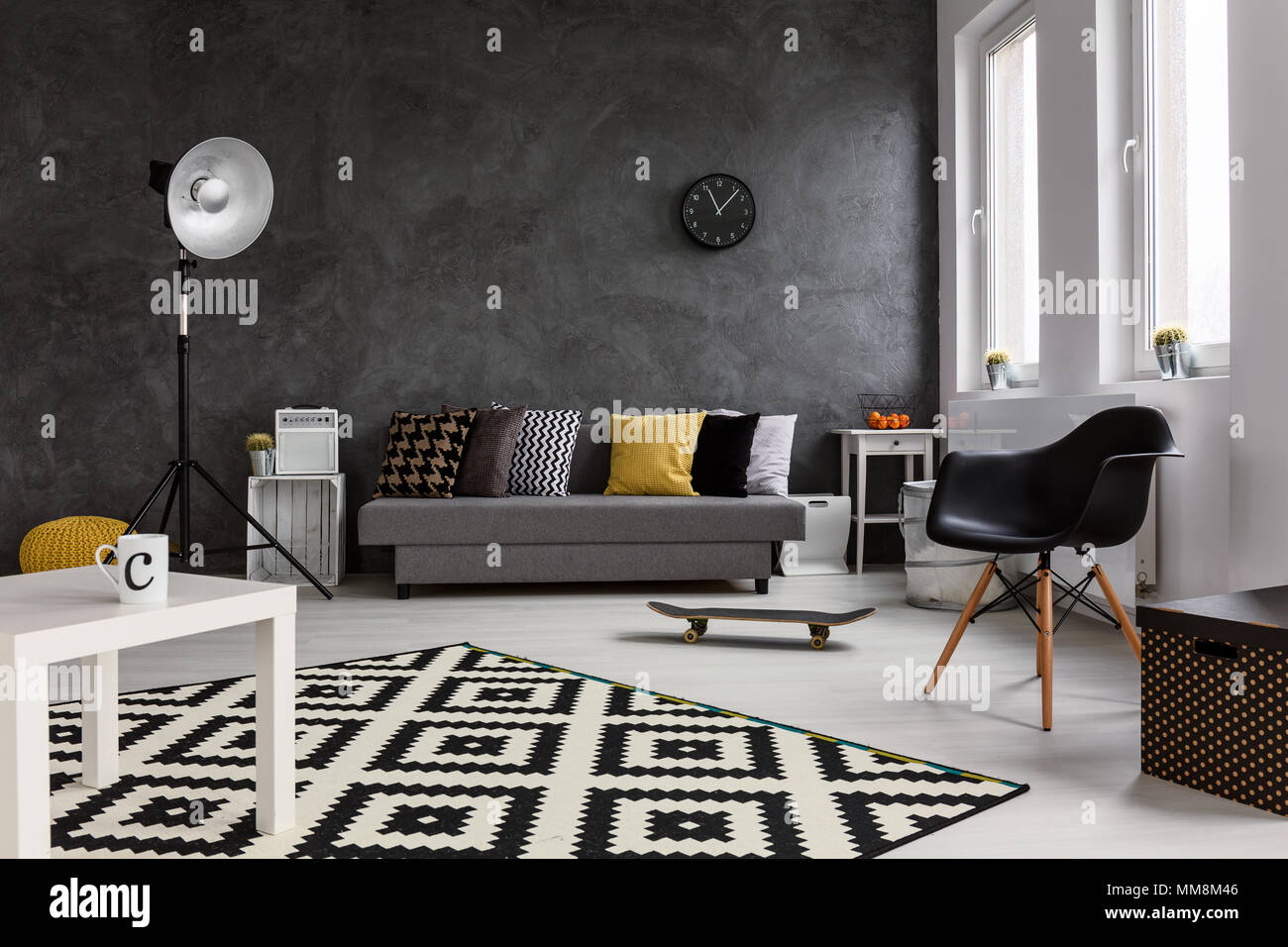 Grey Living Room With Sofa Chair Standing Lamp Small White Table And Black And White Pattern Carpet Stock Photo Alamy Fall Living Room Decor