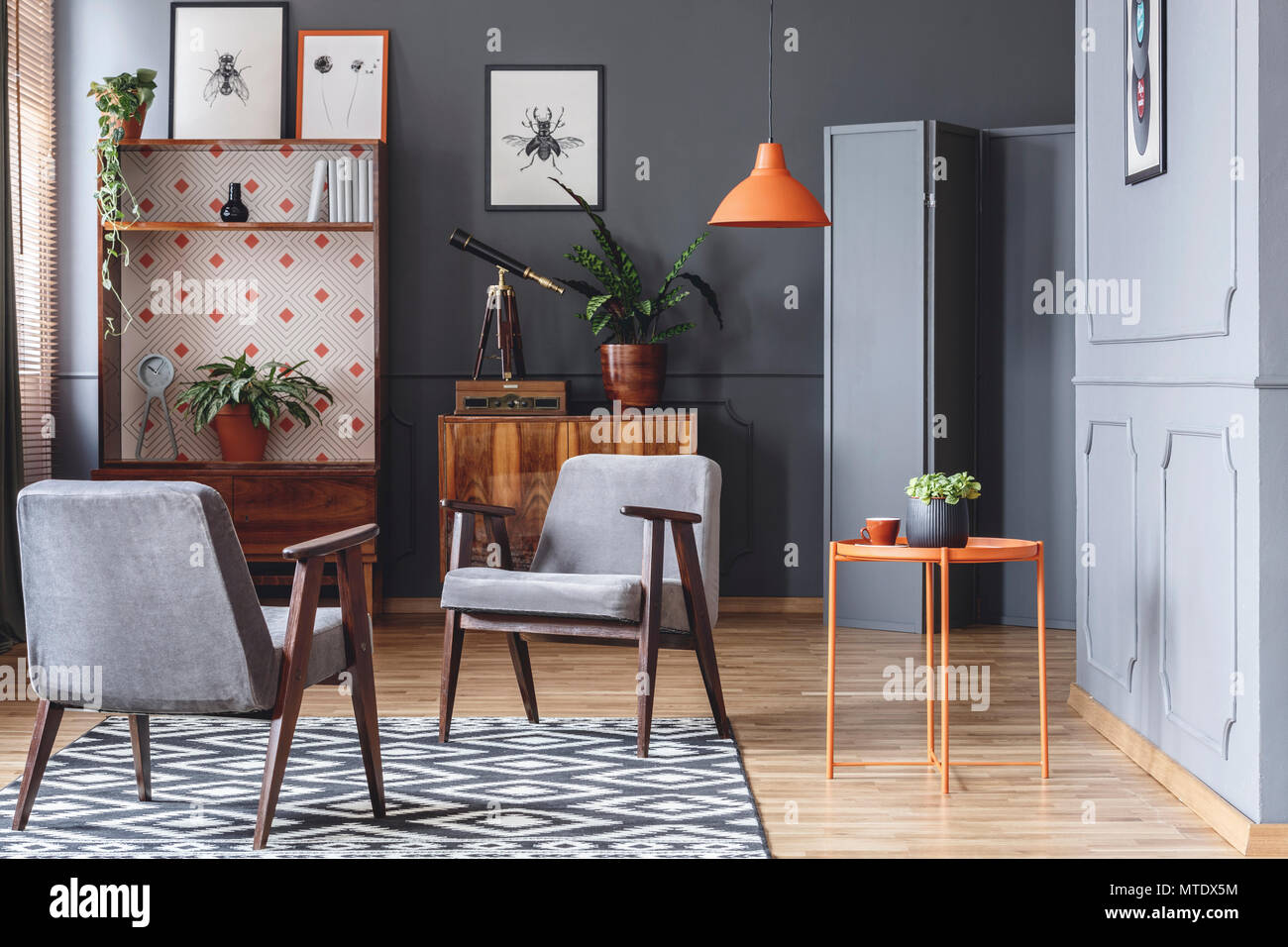 Two Armchairs Orange Coffee Table Plants Wooden Cupboards And Grey Walls In A Living Room Interior Stock Photo Alamy Living Room Modern Wall Art Ideas
