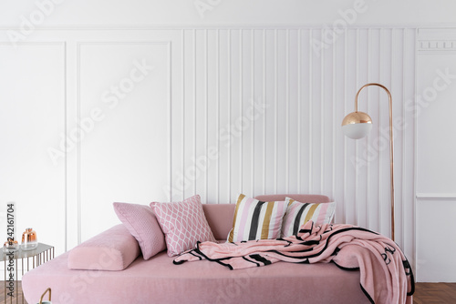 - Premium Photo Cozy Living Room Corner With Pink Velvet Sofa And Gold Floor Lamp In Modern Classic Style On Top With Pink Fluffy Blanket With White Wooden Stripe Wall Fireplace And Tv Living Room Design,