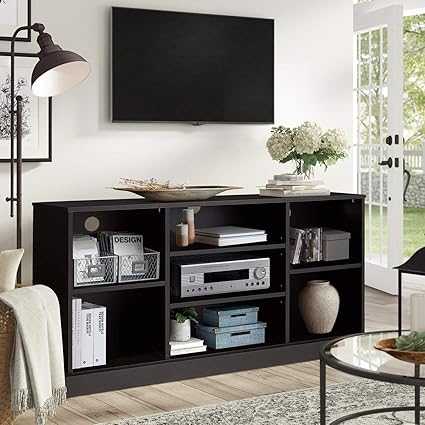 We furniture minimal farmhouse wood universal stand for tvs up to 64 flat screen living room storage shelves entertainment center 58 inch black.
