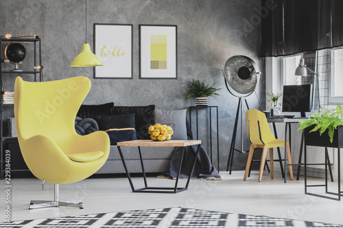 Scandinavian Design Living Room With Grey Concrete Wall And Modern Yellow Furniture Real Photo Buy This Stock Photo And Explore Similar Images At Adobe Stock Adobe Stock Modern Tables For Living Room Ikea