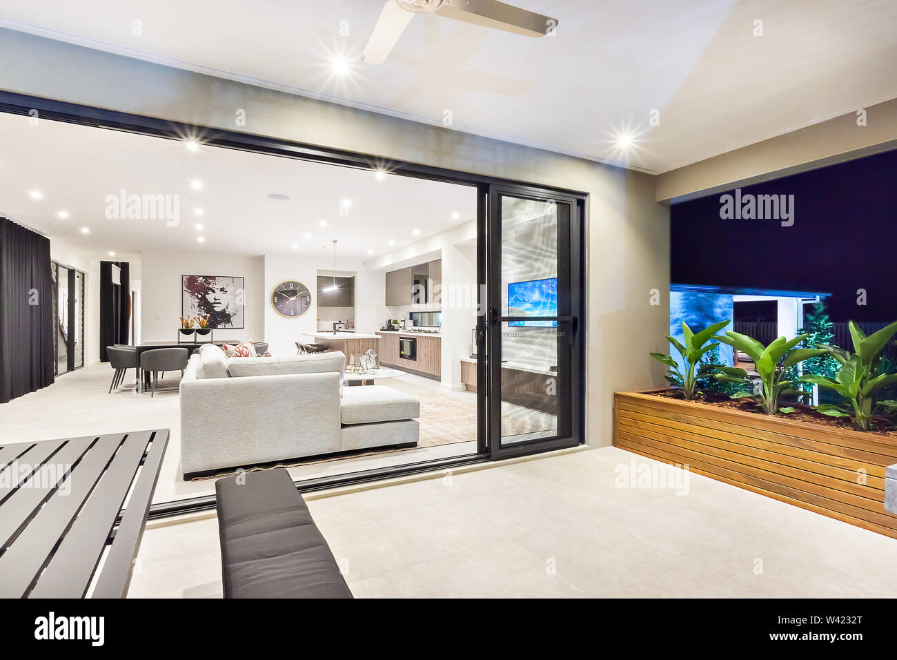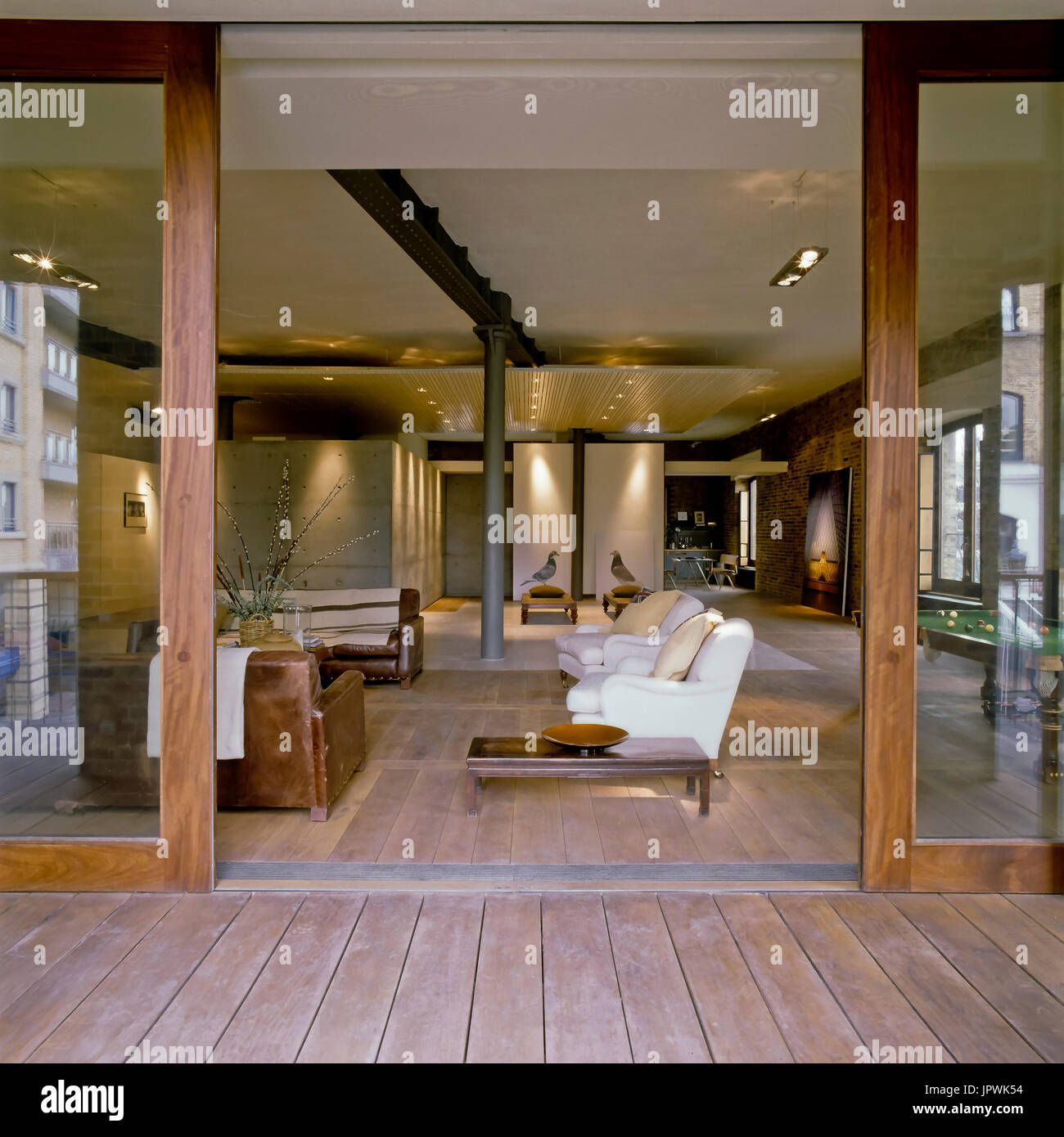 Open Sliding Doors Leading Into Modern Style Living Room Stock Photo Alamy Living Room Modern Interior Furniture Design
