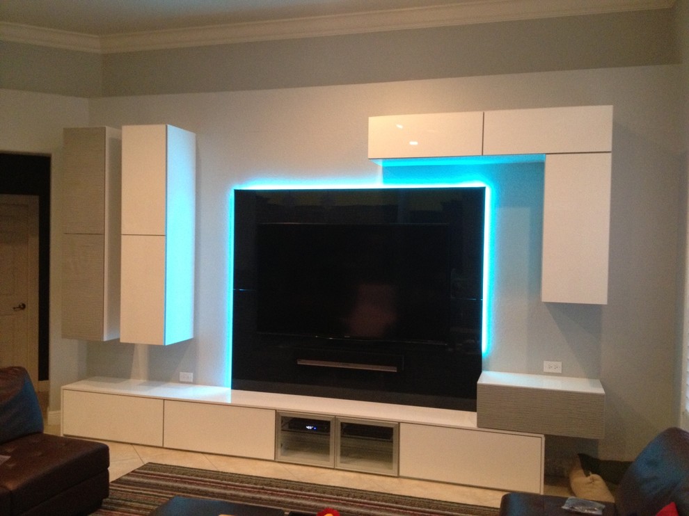 The boone 18 comes with built in brackets to conveniently hang your tv and save floor space. The picture is an example of a home entertainment center for a small living room. High gloss alumina grey door fronts shimmer between white formica tops.