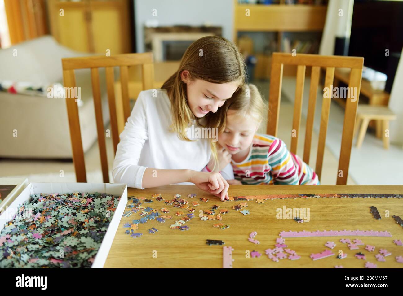 Cute Young Girls Playing Puzzles At Home Children Connecting Jigsaw Puzzle Pieces In A Living Room Table Kids Assembling A Jigsaw Puzzle Fun Family Stock Photo Alamy Country Primitive Living Room Furniture