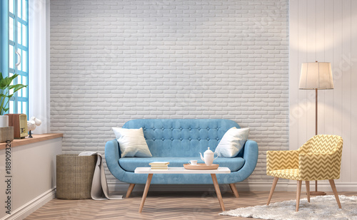 Vintage Living Room 3d Rendering Image The Rooms Have Wooden Floors And White Brick Walls Furnished With Blue Sofa And Yellow Chair There Are Blue Window Overlooking To The Nature Buy This Stock Living Room Chair Nz